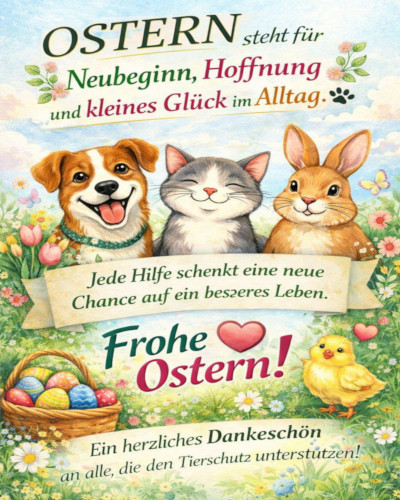 Jedes gerettete Tier, jedes neue Zuhause und jede kleine Geste der Hilfe schenkt Hoffnung – nicht nur zu Ostern, sondern das ganze Jahr über. Gemeinsam können wir weiterhin dafür sorgen, dass Tiere in Not eine zweite Chance bekommen.